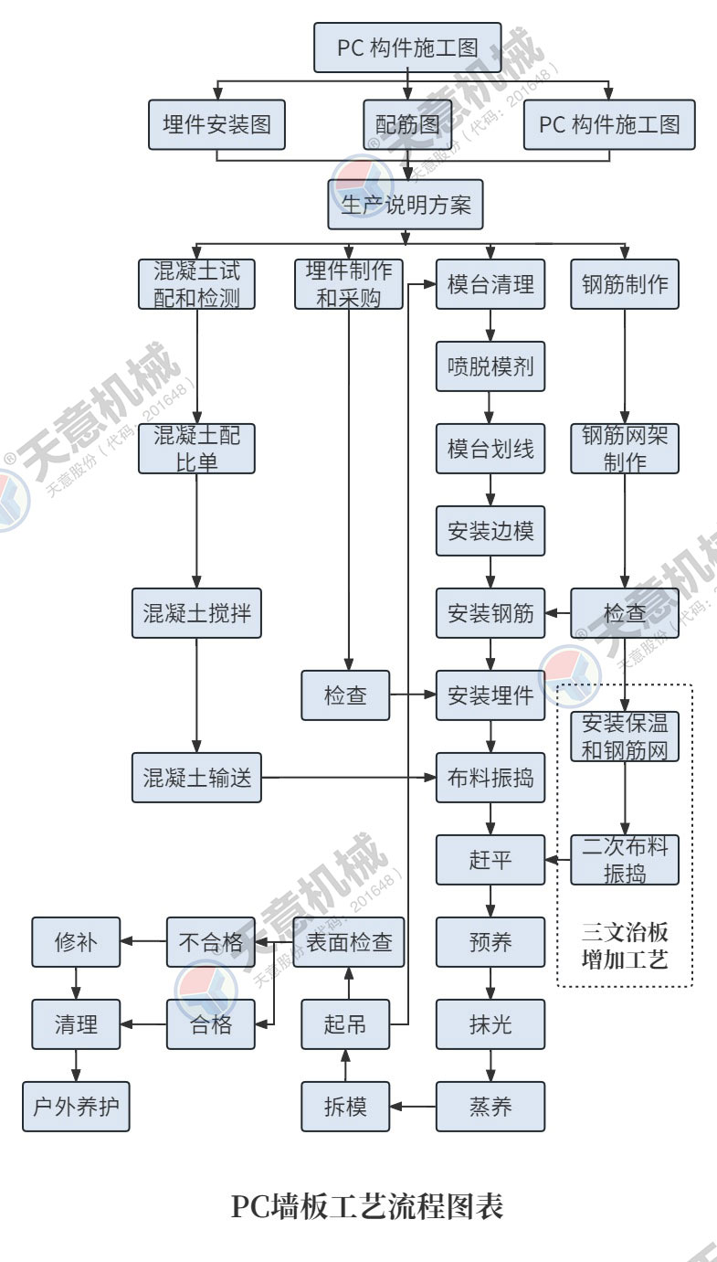 PC環(huán)形疊合板/內(nèi)墻板生產(chǎn)線的主要設(shè)備包括雙梁橋式起重機(jī)、清理機(jī)、脫模劑噴涂機(jī)、布料機(jī)、振動(dòng)臺(tái)、趕平機(jī)、拉毛裝置、預(yù)養(yǎng)窯、抹光機(jī)、碼垛車、養(yǎng)護(hù)窯、翻轉(zhuǎn)機(jī)、擺渡車、支撐滾輪、驅(qū)動(dòng)輪、模臺(tái)和成品運(yùn)輸車等。