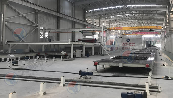 產(chǎn)品展示PC環(huán)形疊合板生產(chǎn)線采用高精度、高結(jié)構(gòu)強(qiáng)度的成型模具,經(jīng)自動(dòng)布料機(jī)把混凝土澆筑其中、振動(dòng)臺(tái)振搗后并不立即脫模,而是經(jīng)預(yù)養(yǎng)護(hù)、蒸汽養(yǎng)護(hù),使構(gòu)件強(qiáng)度滿足設(shè)計(jì)強(qiáng)度時(shí)才進(jìn)行拆模處理,拆模后的成品構(gòu)件運(yùn)輸至成品暫存區(qū)或室外堆場(chǎng),而空模臺(tái)沿輸送線自動(dòng)返回,形成自動(dòng)化環(huán)形流水作業(yè)。