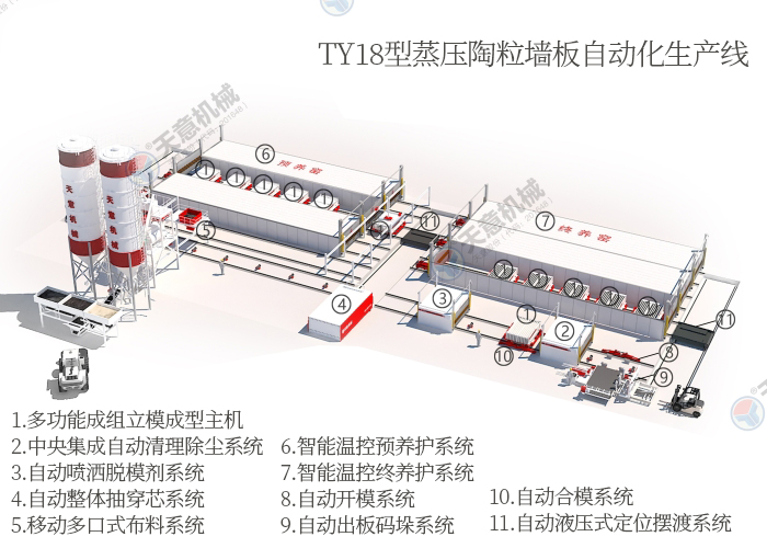 近年來,混凝土空心墻板發(fā)展迅速,究其原因是其原材料水泥和粗細(xì)骨料易于購買,生產(chǎn)效率高能夠?qū)崿F(xiàn)半機(jī)械化或者機(jī)械化生產(chǎn)等因素。其中陶粒混凝土應(yīng)用于輕質(zhì)隔墻板中,能夠進(jìn)一步提高輕質(zhì)隔墻板的性能,因此在天意機(jī)械的客戶中生產(chǎn)陶粒墻板的客戶也是越來越多,下面主要為大家介紹一下陶?;炷翂Π宓呐浞奖壤皦Π鍣C(jī)生產(chǎn)工藝。